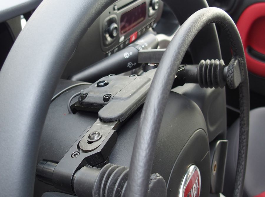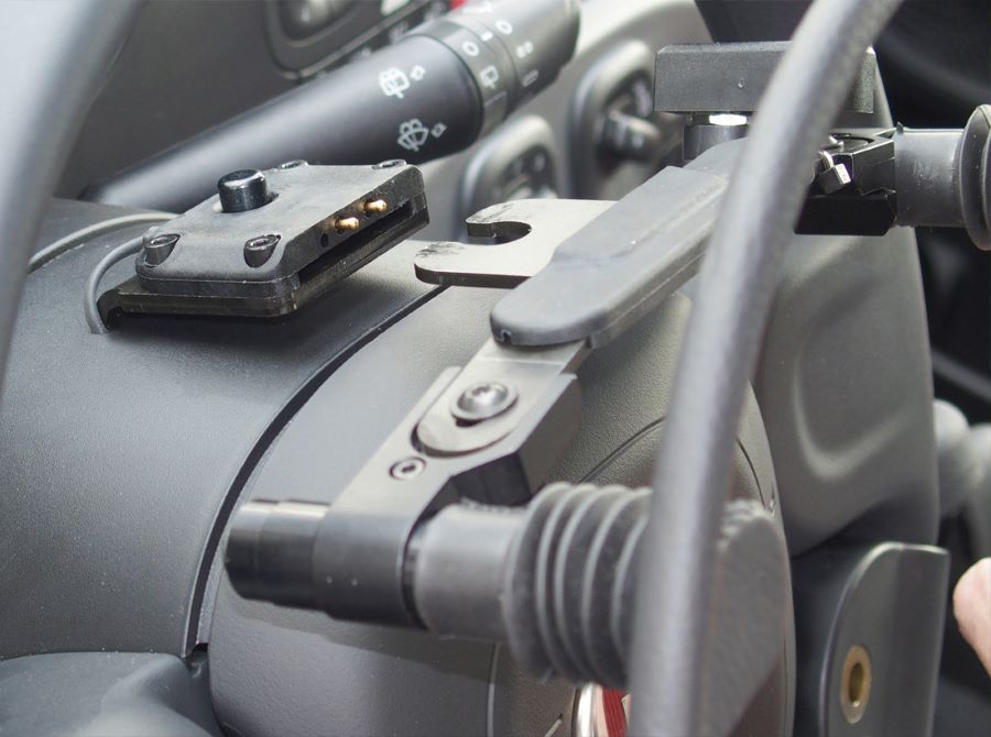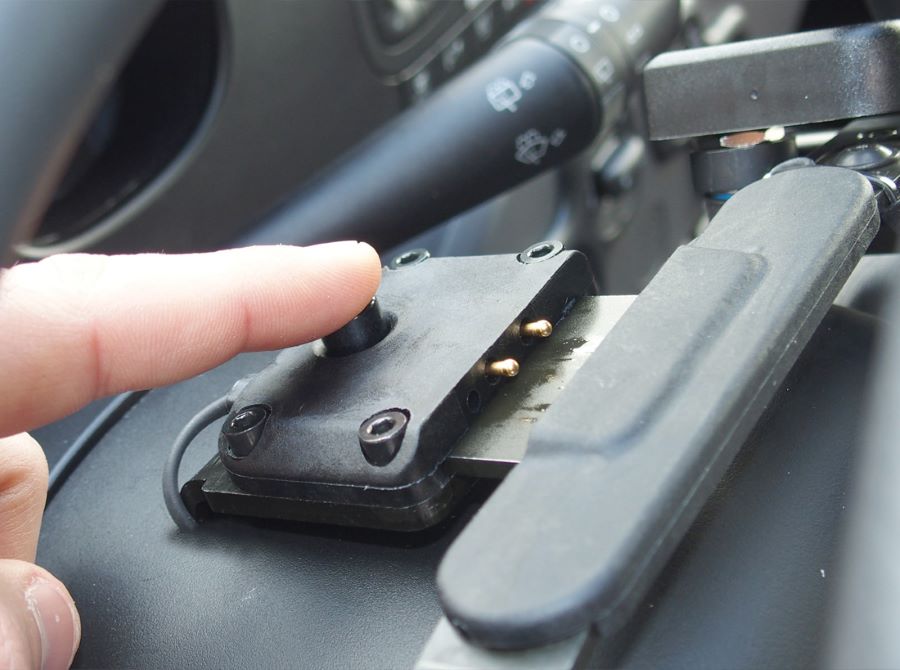 Esta solución, además de contar con las mismas prestaciones que el modelo D906GV, permite la liberación rápida del aro del volante original con solo pulsar el botón del soporte de fijación. Esto es posible sin necesidad de desconectar ninguna conexión eléctrica. Con el fin de garantizar una mayor seguridad, el sistema está diseñado de tal manera que no permite la aceleración si no se activa correctamente.