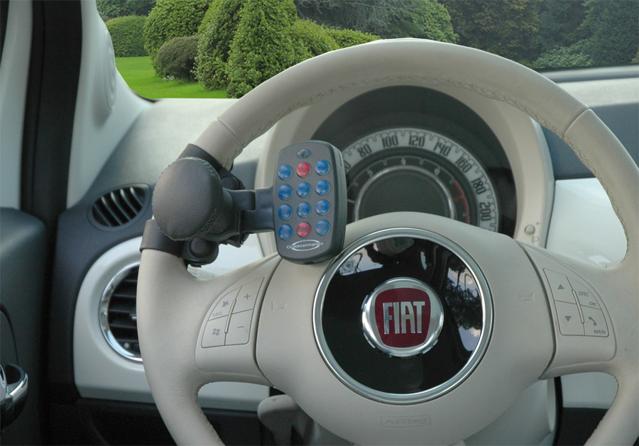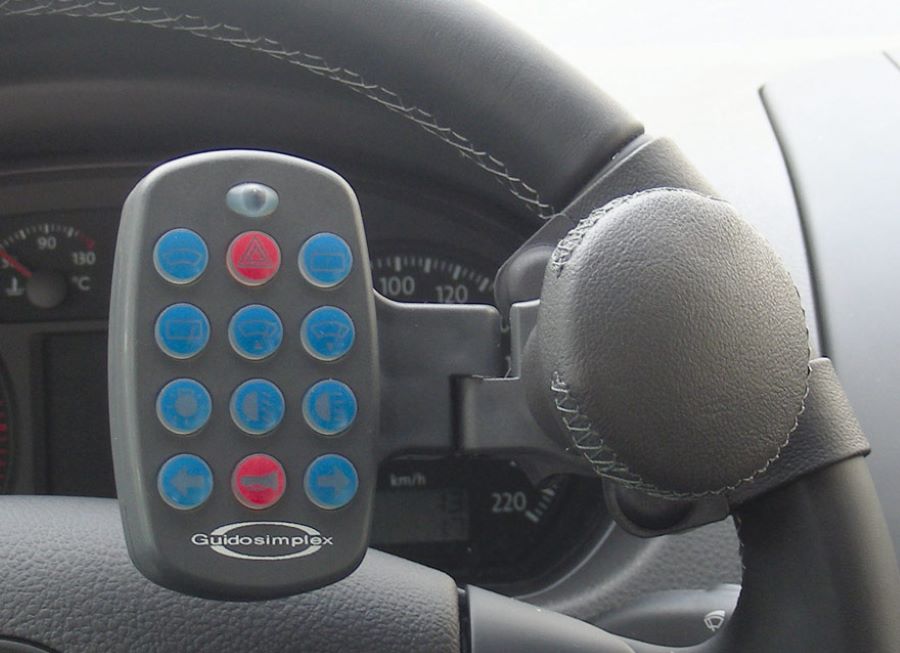 El dispositivo aplicado al volante permite, a través de una botonera, accionar los mandos de luces, intermitentes, limpiaparabrisas, bocinas, etc. muy rápidamente. La posición del control manual se puede ajustar para permitir el uso de las teclas de selección de funciones de acuerdo con la mano del usuario. Para facilitar la visión nocturna, los símbolos se iluminan mediante un interruptor. El dispositivo se suministra con un pomo para girar el volante y se puede aplicar tanto a la derecha como a la izquierda y es posible sacarlo de su fijación mediante un botón.