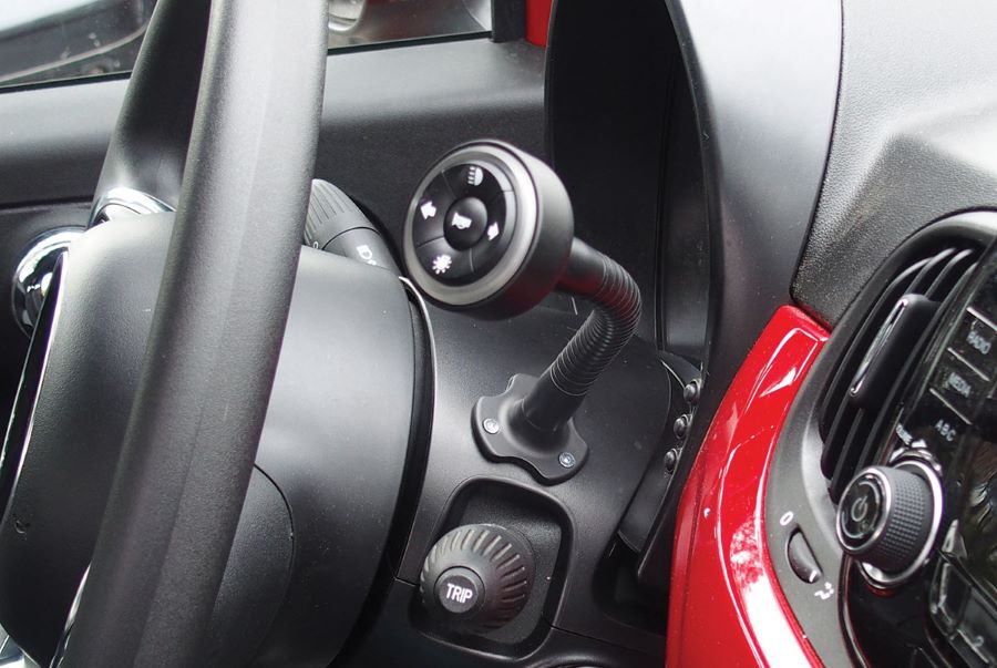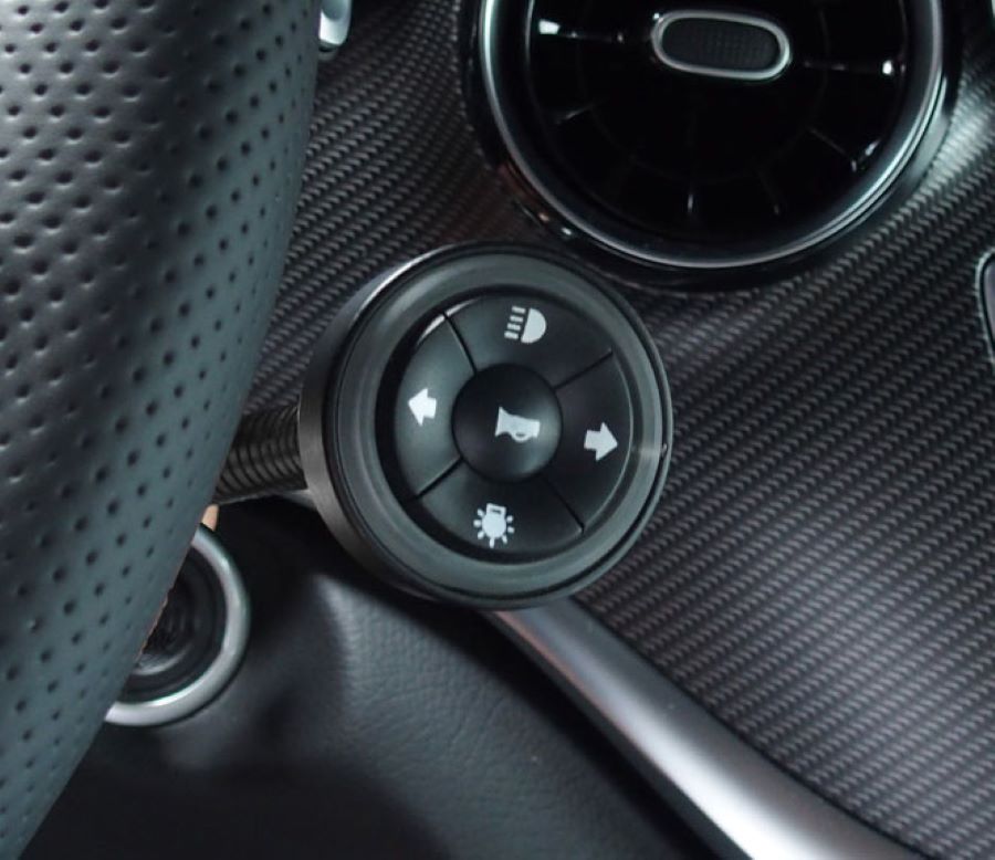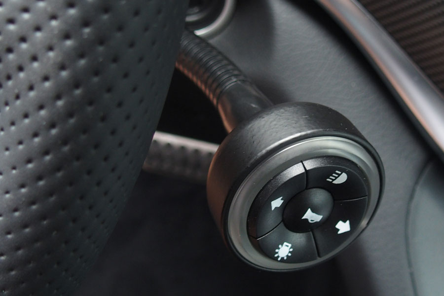 Un pequeño botonero, situado a la derecha del volante cerca de la palanca del limpiaparabrisas, permite accionar las luces, los intermitentes e incluso el claxon con los dedos de la mano derecha y sin salir del volante. Este dispositivo es adaptable a cualquier tipo de vehículo e interactúa perfectamente con los mandos originales. El diseño único permite una fácil instalación y colocación de acuerdo con las necesidades individuales.
