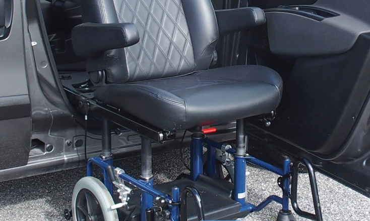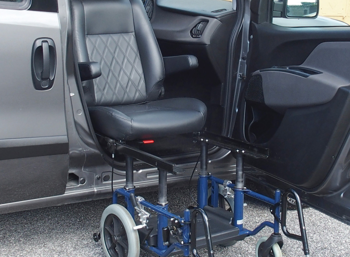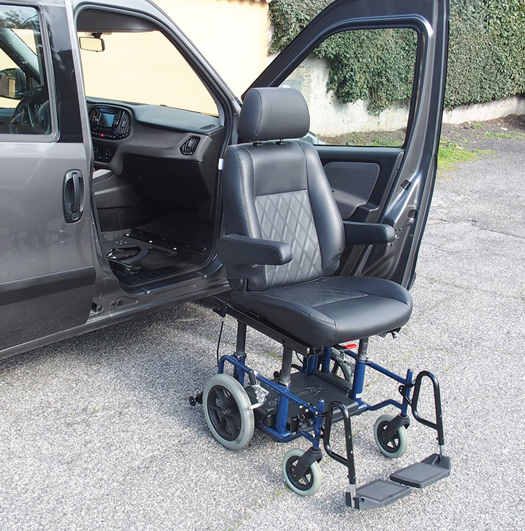 Silla de ruedas ortopédica diseñada para simplificar el traslado en el coche y viceversa, permitiendo al pasajero moverse de forma independiente sin sobrecargar los brazos y la espalda. El sistema consta de un carro con ruedas (regulable en altura), un cómodo asiento para ser utilizado tanto en el exterior como en el interior del vehículo y una base giratoria instalada en el interior del coche.