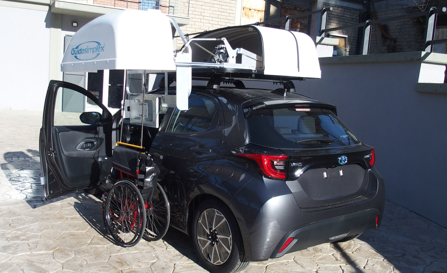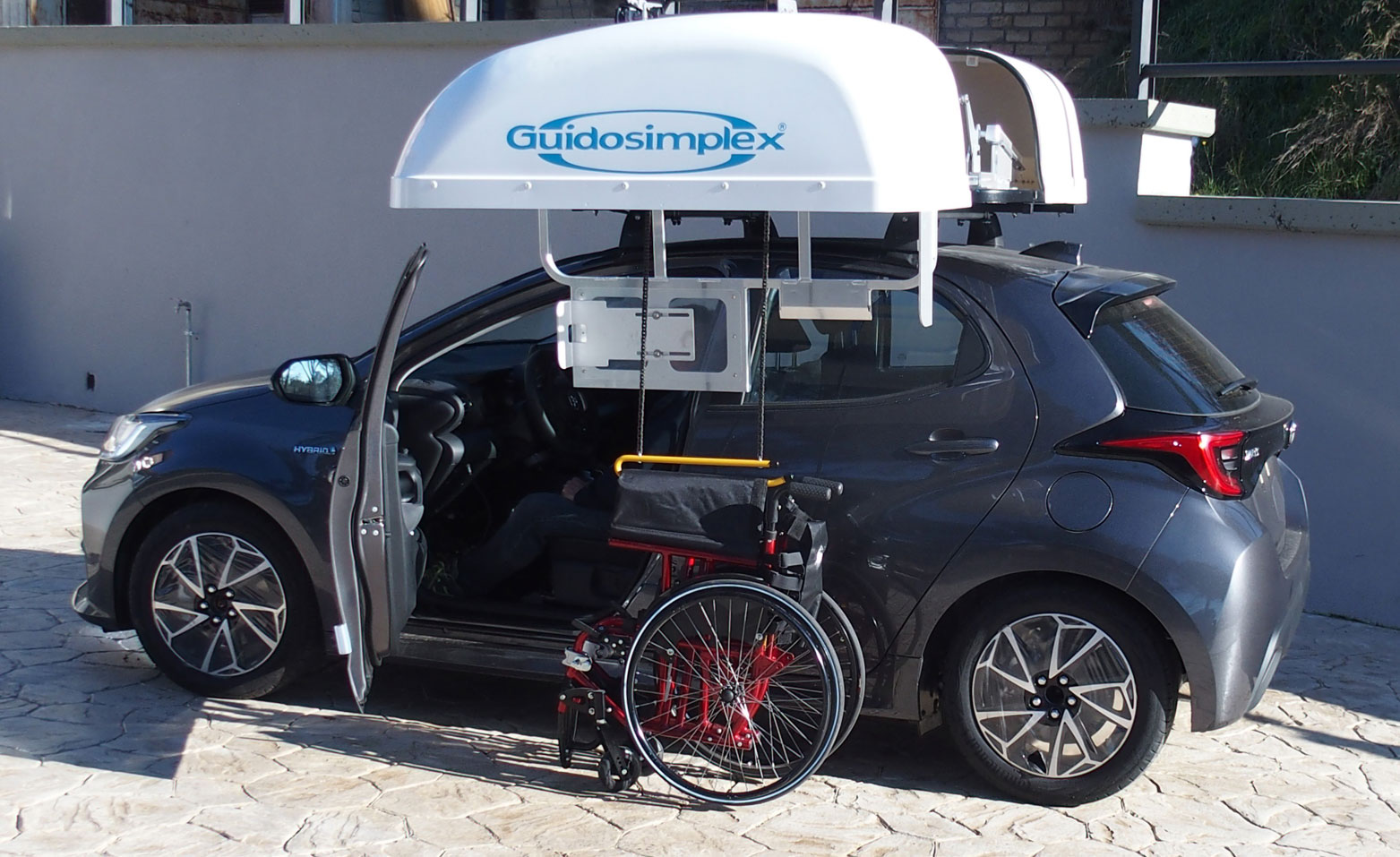 El TRAN-WCT es un sistema desarrollado para usuarios que, por comodidad o necesidades personales, prefieren no trasladar su silla de ruedas dentro del coche. Esta cargadora de sillas de ruedas se fija al techo del coche a través de soportes adecuados y permite colocar la silla de ruedas sobre una estructura especial, que se transportará sin ningún daño y protegida de los agentes atmosféricos a través de una resistente cubierta de ABS que se puede pintar en el color del coche bajo pedido. La cubierta se abre horizontalmente, lo que permite utilizar el cargador de sillas de ruedas incluso en plazas de aparcamiento cubiertas con una altura de techo limitada. Por otro lado, la silla de ruedas se puede descender y ascender verticalmente, lo que permite utilizarla incluso en el caso de aparcar en espacios reducidos. Se proporciona un control remoto para manejar el cargador de silla de ruedas. Toda la operación tarda unos 80 segundos en completarse.