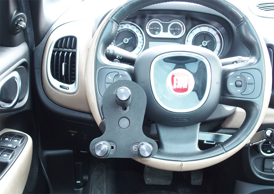 La empuñadura del volante de tres puntas permite una rotación de 360° del volante con una sola mano. Su forma particular le permite ajustarlo constreñiendo su mano con total seguridad, las tres puntas también le permiten ejercitar la rotación usando la muñeca también.